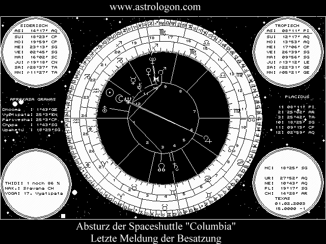 Wir sehen eine durchaus interessannte Spannungskonstellation. Der Neumond im Zeichen Wassermann (Luftfahrt / Technik) findet in Konjunktion mit dem Neptun statt und steht in exakter Opposition zum Jupiter. Die Ursache könnte demnach ein durch Flüssigkeiten (Neptun, Mond), bzw. Feuchtigkeit verursachter Schaden, Kurzschluß oder eine falsch (NE/AQ) geschaltete Platine gewesen sein. Als die Shuttle startete verlor sie einen Teil der Isolierung eines Außentanks! Dies kann beim Wiedereintritt in die Atmosphäre zu dem Unfall geführt haben.